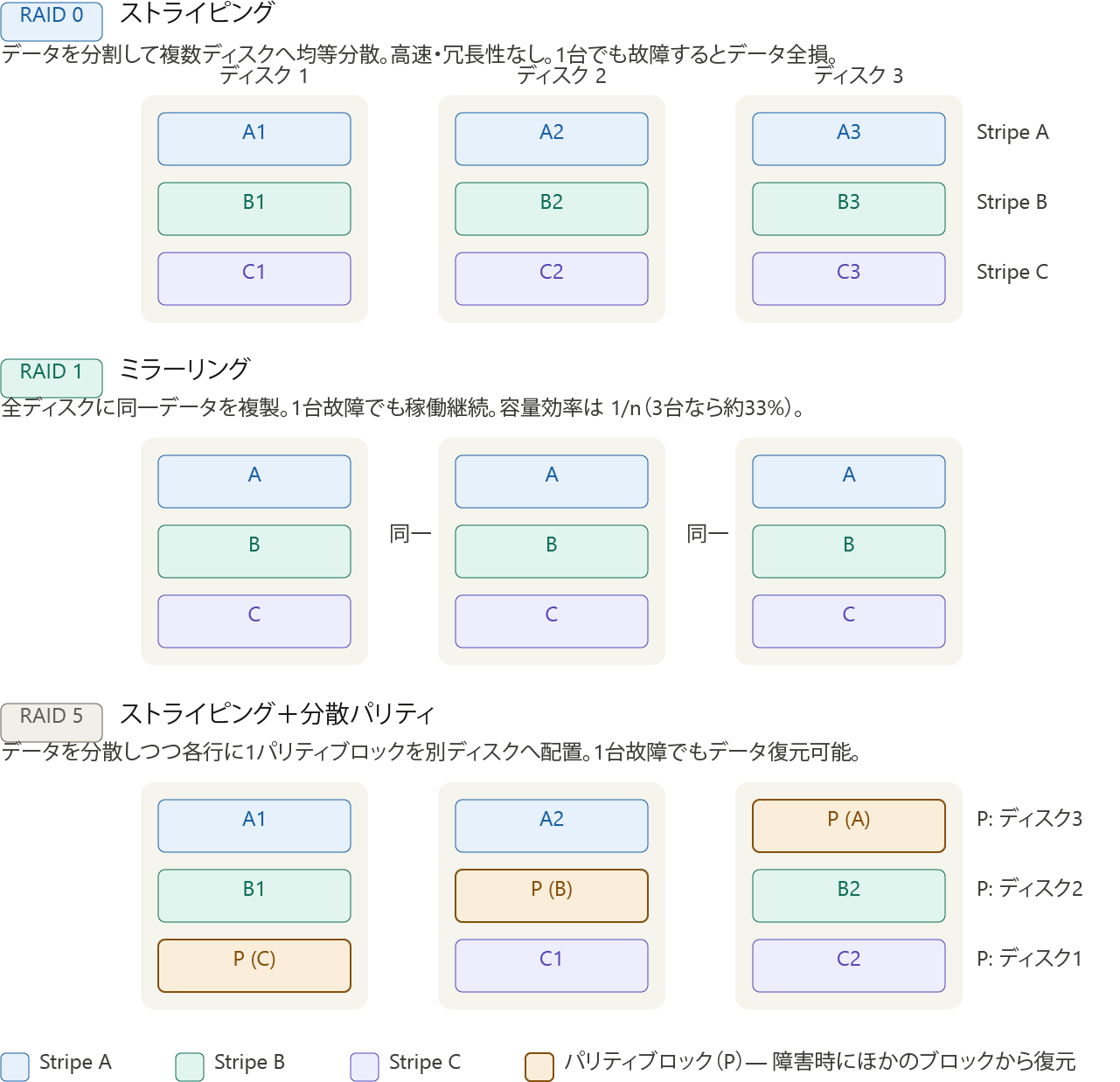 基本情報技術者 平成21年春 問13 2026.03.28 RAID 1〜5の各構成は、何に基づいて区別されるか。 ア 構成する磁気ディスク装置のアクセス性能 イ コンピュータ本体とのインタフェースの違い ウ データ及び冗長ビットの記録方法と記録位置の組合せ エ 保証する信頼性のMTBF値 Show answer 基本情報過去問 , RAID