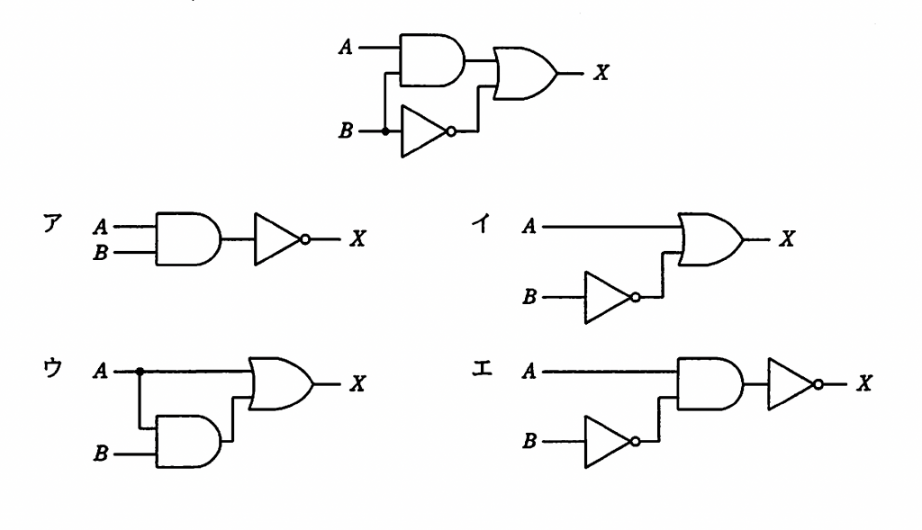 元の図の回路は A と B の AND の解と B の 否定を OR 回路に入力する構成。これと同じ解になるものを選択肢から探す。