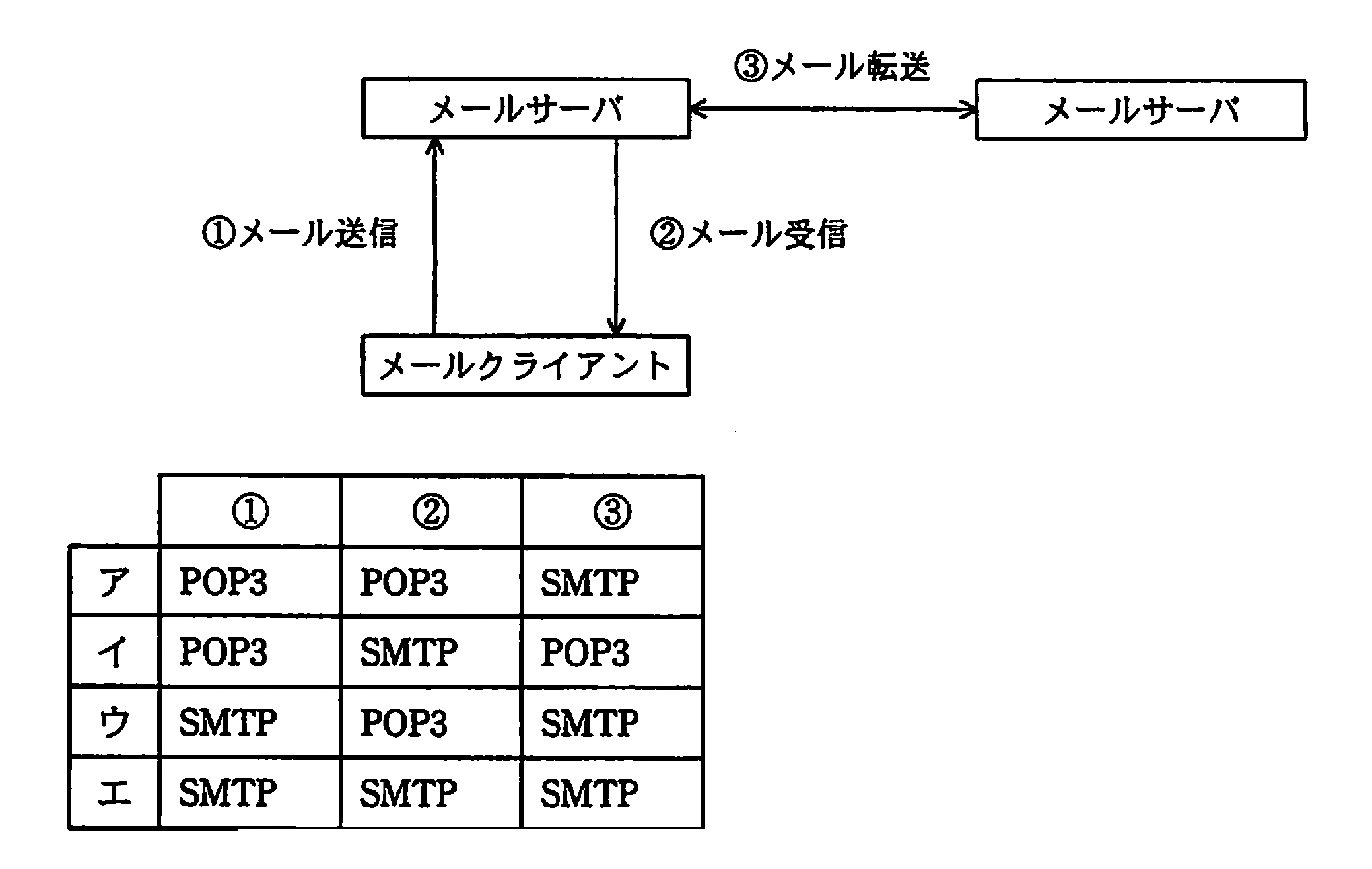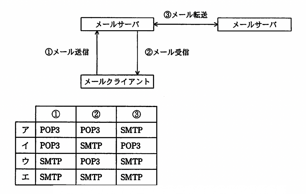 基本情報技術者 平成21年春 問39 2026.04.27 図の環境で利用される 1 〜 3 のプロトコルの組合せとして,適切なものはどれか。 基本情報過去問 , 平成21年春試験 , SMTP , POP3 , ネットワーク , 技術要素 , ネットワーク応用 , メールプロトコル